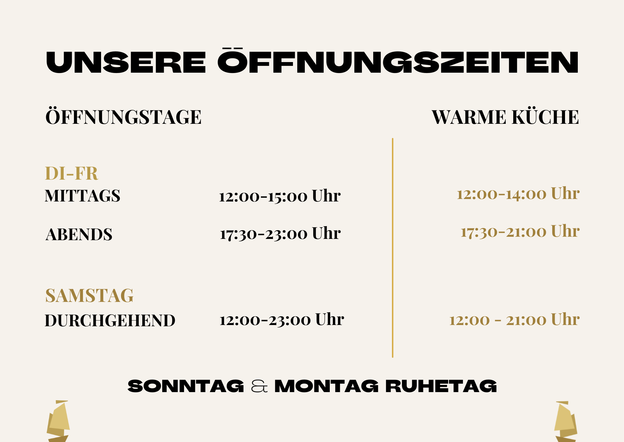 Samstag durchgehend geöffnet und warme Küche 12:00 bis 21:00 Uhr